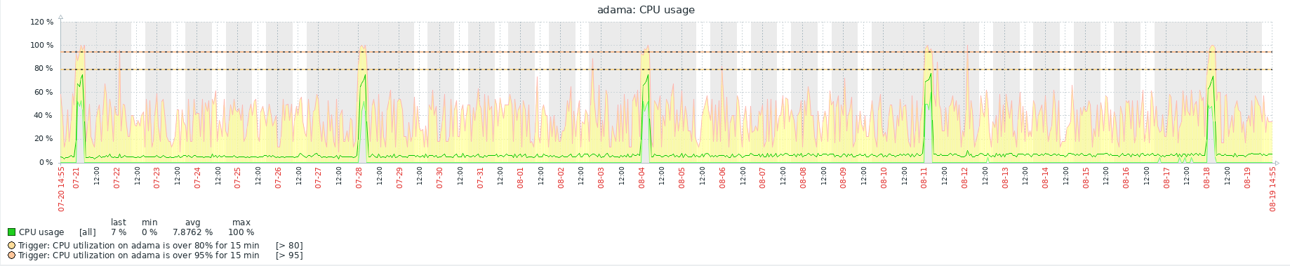 Monitoring IT resources is the more-common use of Zabbix, I used the same server to monitor network and server resources. You can see a graph of one of the server’s CPU usage below.